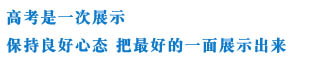 邵庆辉:第一,保持一个良好的心态;第二,保持一个健康的身体;第三,我借用我们学校一位老师说过的话,高考不是一次考验,而要当成一次展示,把自己最好的一面在高考考场上展示出来,那么我想大家肯定能够取得一个非常好的成绩。