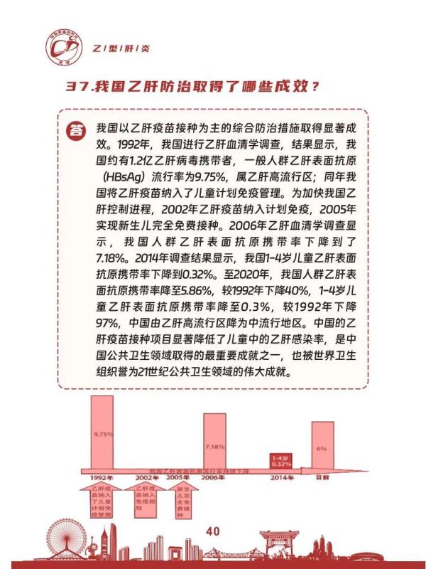 内容提要:乙型肝炎是我国重点防控的乙类传染病,该病危害大,可导致肝硬化、肝癌。中国以疫苗接种、阻断传播为主的综合防控策略取得显著成效,目前已从高流行区降至中流行区,但估算目前仍约每17个人中就有1人为慢性乙肝病毒感染者,是我国重要的公共卫生问题。