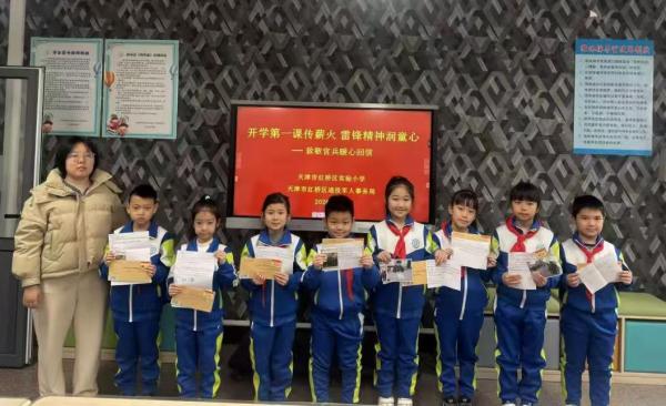 红桥区实验小学作为国防示范校,联合区退役军人事务局开展系列主题活动,春节前组织学生创作书画寄往边疆哨所,新学期收到边防官兵暖心回信后开展主题活动,学生朗读回信、传阅戍边照片,将雷锋精神与爱国拥军情怀融入开学第一课。